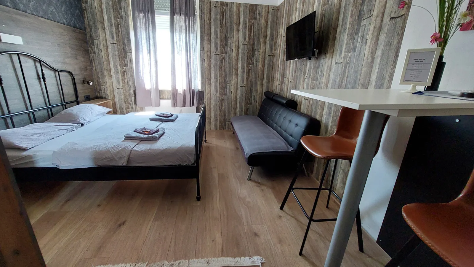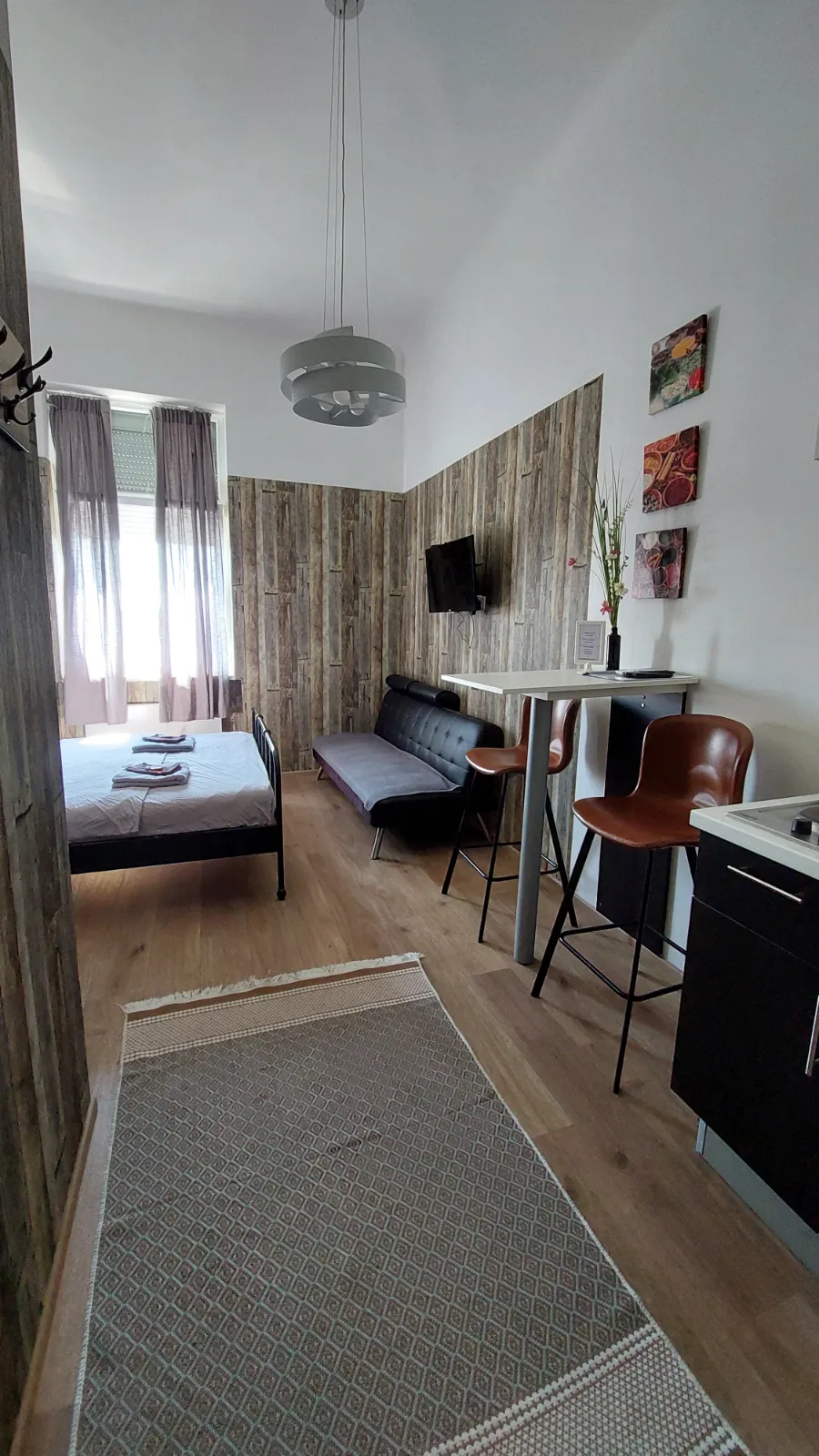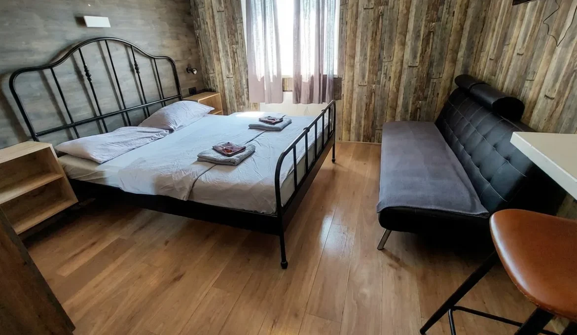 The studio apartment is located on the second floor. where are four more rooms. It is equipped with one Queen bed with comfortable mattress for a good night sleep, and a sofa that can be used as bed if needed. The studio apartment has view to the south, street and city view. It is decorated in a rustic style – walls covered in imitation wood wallpaper, wooden furniture, natural earthy tones prevail, pleasant and warm. The apartment has a kitchen with a refrigerator, a stove and everything else needed for cooking. The equipped bathroom has a shower cabin. Other facilities for a more pleasant and entertaining stay are a TV with an internet program package, interent and radio acces on TV. The apartment also has a table, chairs, a wardrobe, nightstands, reading lamps, mirror so you can easily store your belongings and feel just like at home.