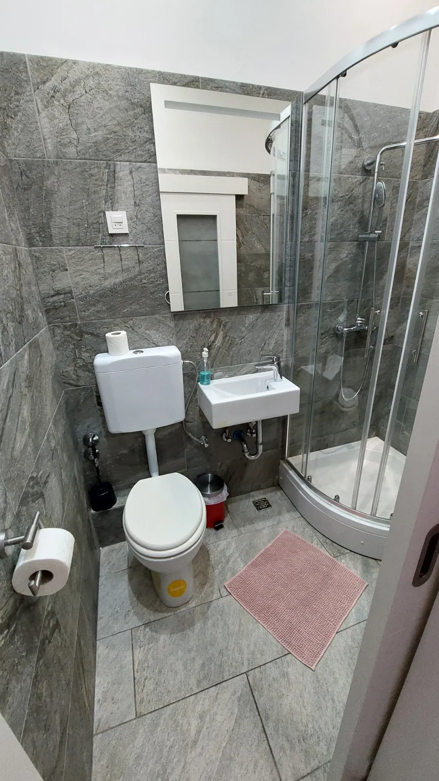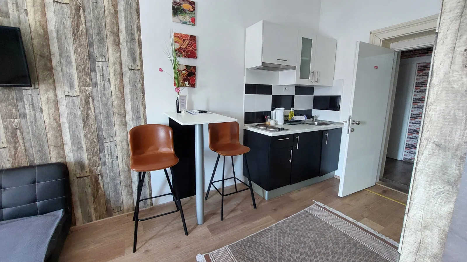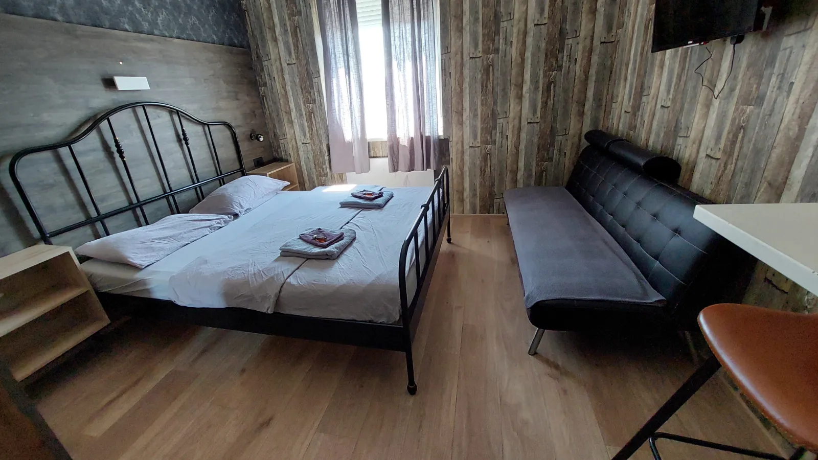The studio apartment is located on the second floor. where are four more rooms. It is equipped with one Queen bed with comfortable mattress for a good night sleep, and a sofa that can be used as bed if needed. The studio apartment has view to the south, street and city view. It is decorated in a rustic style – walls covered in imitation wood wallpaper, wooden furniture, natural earthy tones prevail, pleasant and warm. The apartment has a kitchen with a refrigerator, a stove and everything else needed for cooking. The equipped bathroom has a shower cabin. Other facilities for a more pleasant and entertaining stay are a TV with an internet program package, interent and radio acces on TV. The apartment also has a table, chairs, a wardrobe, nightstands, reading lamps, mirror so you can easily store your belongings and feel just like at home.