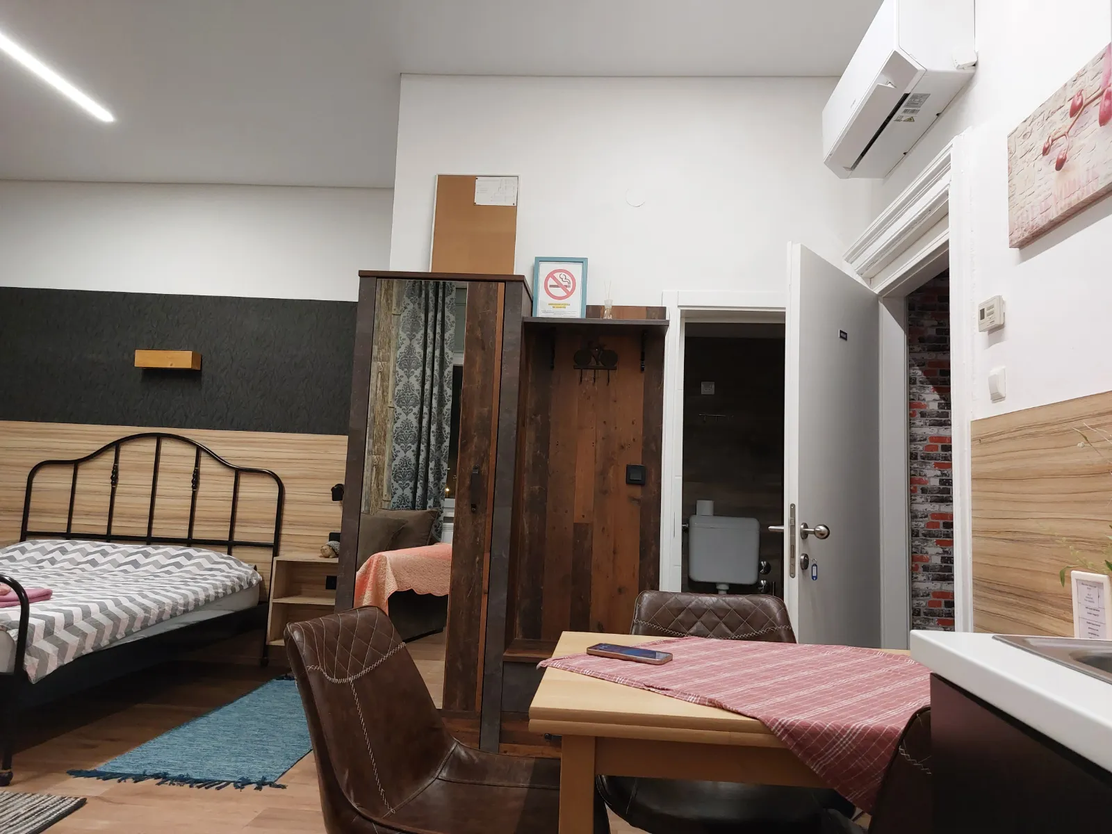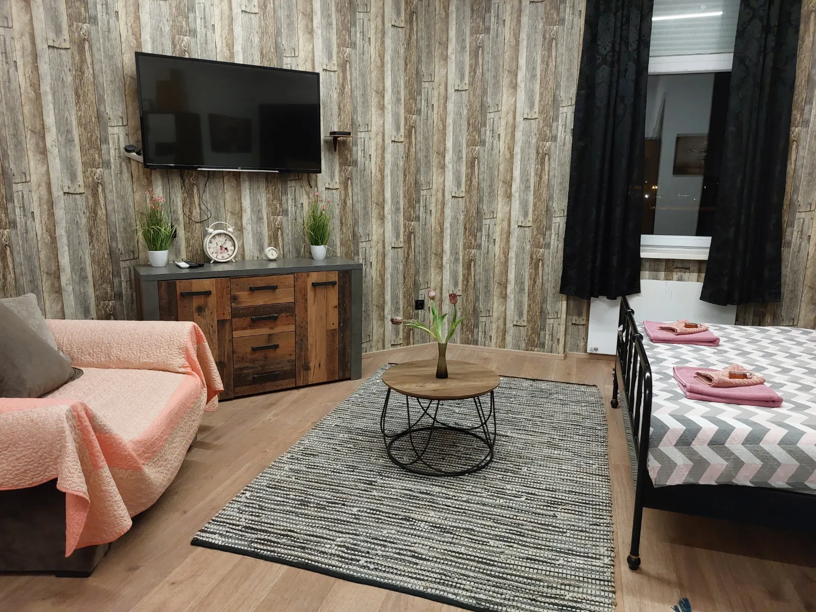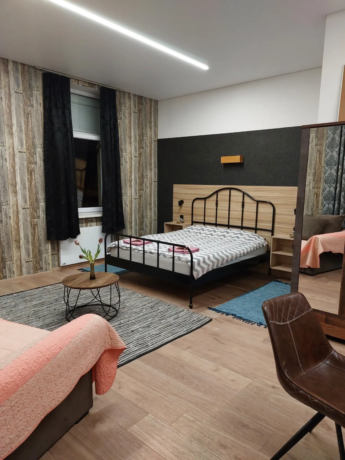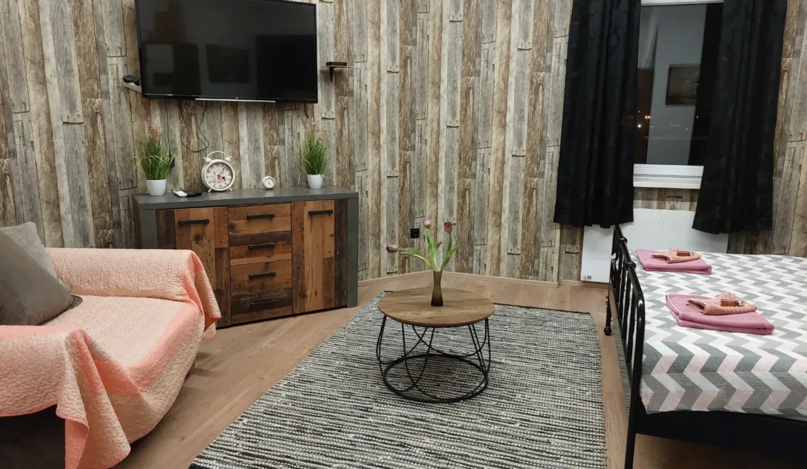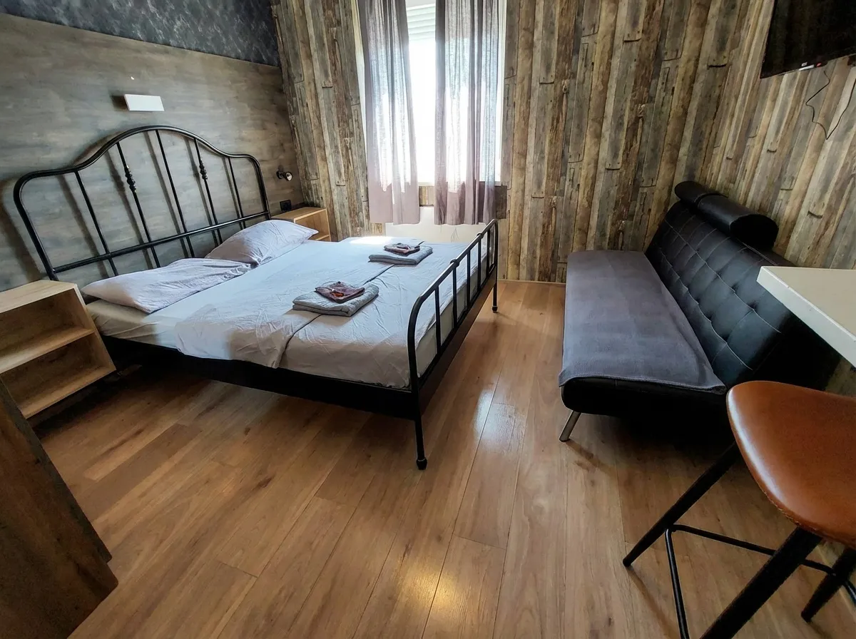 The studio apartmen is located on the second floor. where are four more rooms. It is equipped with one Queen bed with comfortable mattress for a good night sleep, and a folding armcahir that can be used as bed if needed. The studio apartment is in the corner of the building so it has view of the eastern and southern part of the city. It is decorated in a rustic style – walls covered in imitation wood wallpaper, wooden furniture, natural earthy tones prevail, pleasant and warm. The apartment has a kitchen with a refrigerator, a stove and everything else needed for cooking. The equipped bathroom has a shower cabin. Other facilities for a more pleasant and entertaining stay are a TV with an internet program package, interent and radio acces on TV. The apartment also has a table, chairs, a wardrobe, nightstands, reading lamps so you can easily store your belongings and feel just like at home.