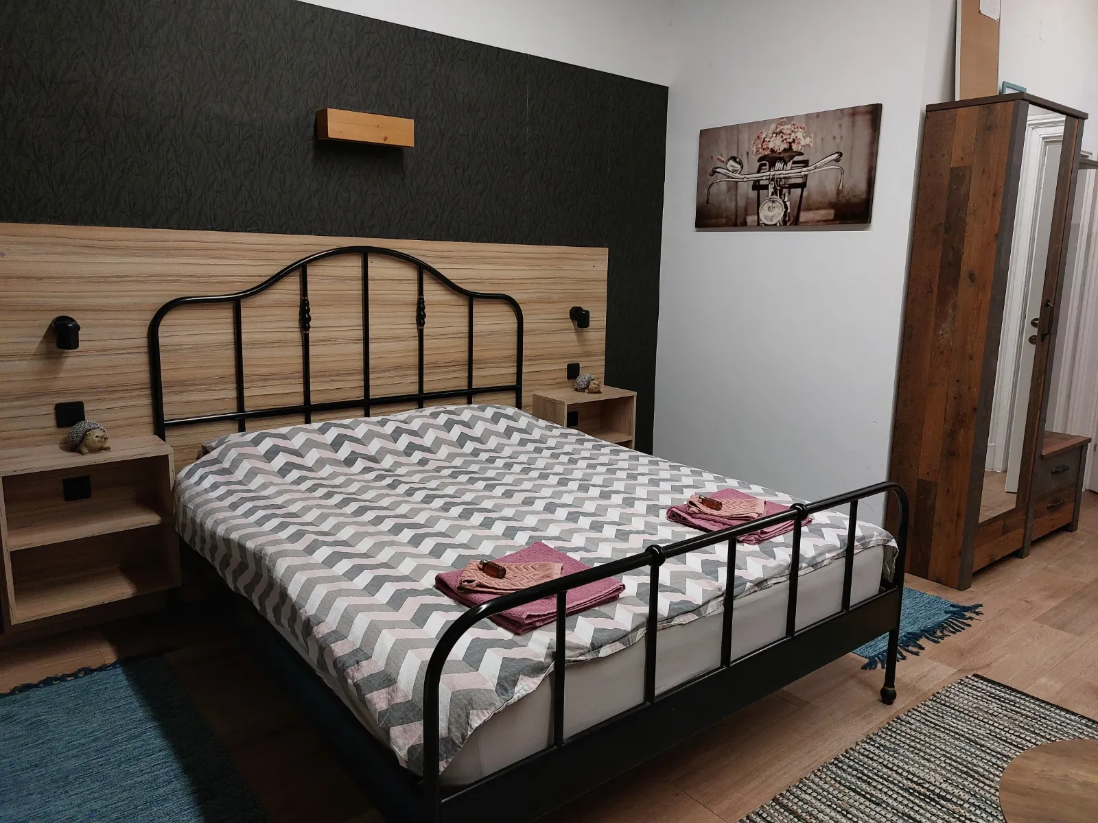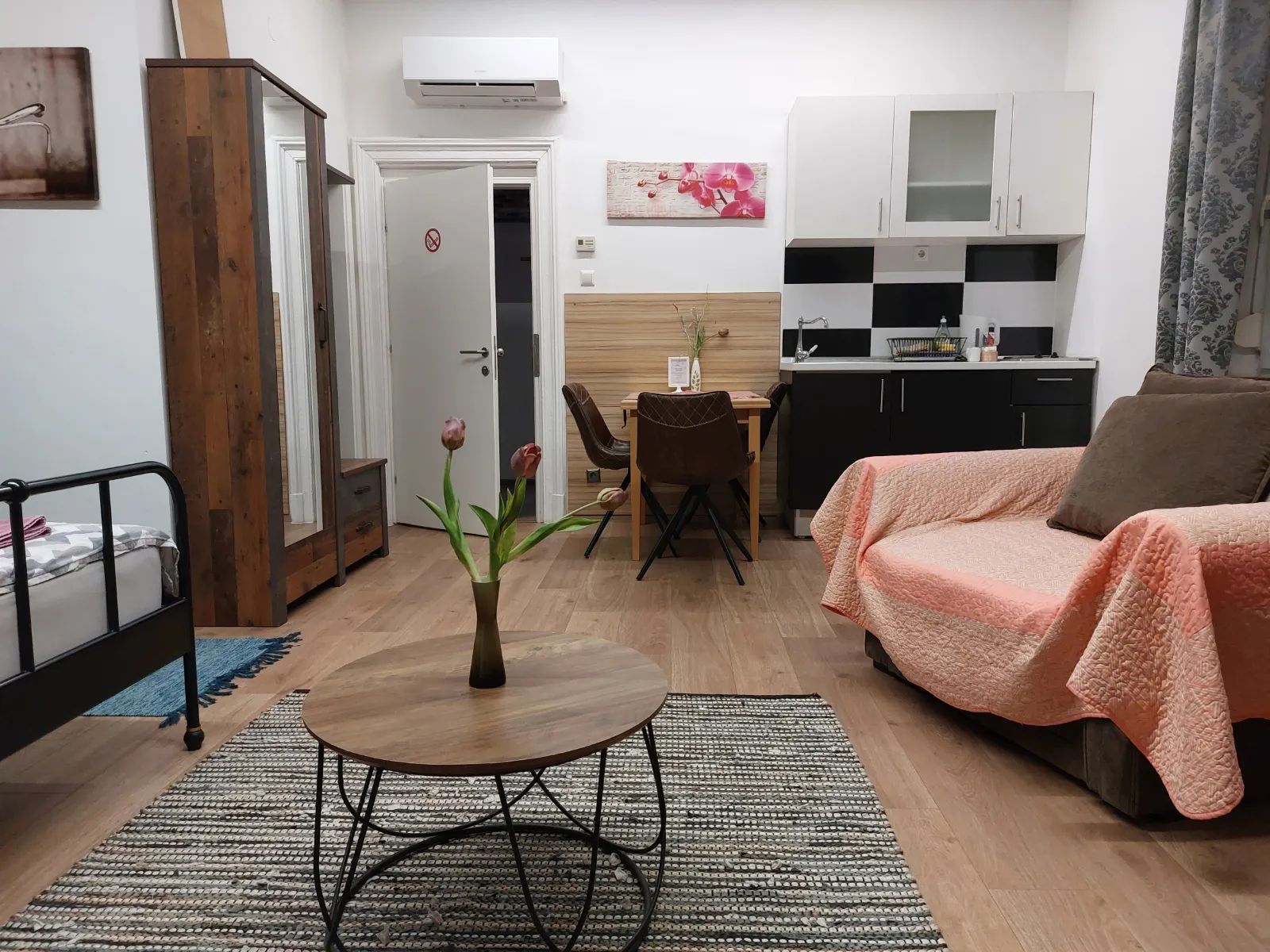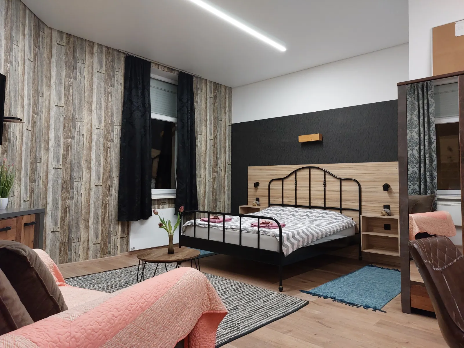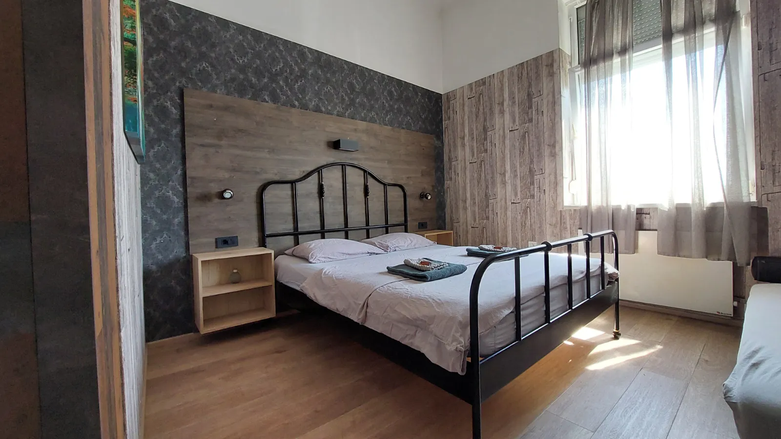 The studio apartmen is located on the second floor. where are four more rooms. It is equipped with one Queen bed with comfortable mattress for a good night sleep, and a folding armcahir that can be used as bed if needed. The studio apartment is in the corner of the building so it has view of the eastern and southern part of the city. It is decorated in a rustic style – walls covered in imitation wood wallpaper, wooden furniture, natural earthy tones prevail, pleasant and warm. The apartment has a kitchen with a refrigerator, a stove and everything else needed for cooking. The equipped bathroom has a shower cabin. Other facilities for a more pleasant and entertaining stay are a TV with an internet program package, interent and radio acces on TV. The apartment also has a table, chairs, a wardrobe, nightstands, reading lamps so you can easily store your belongings and feel just like at home.