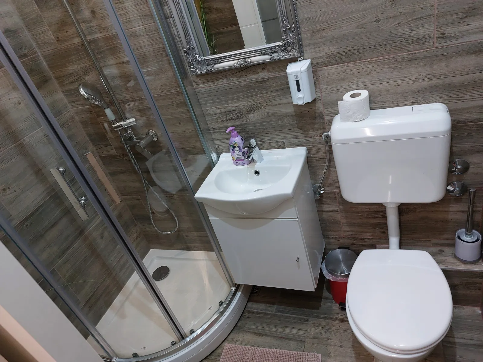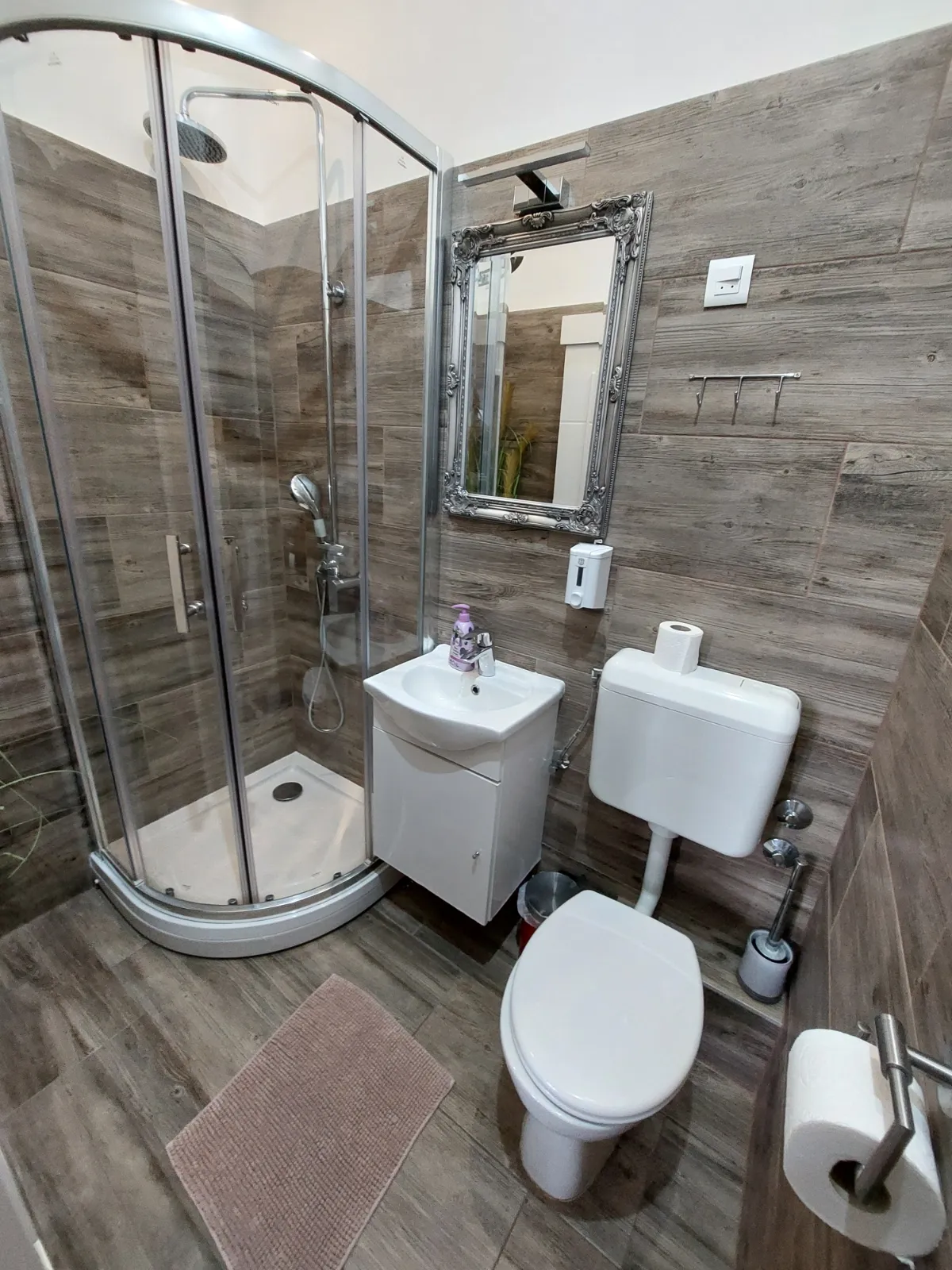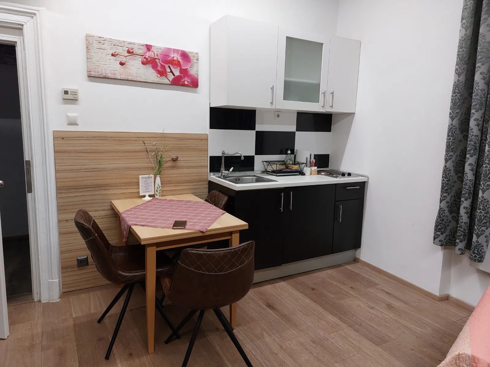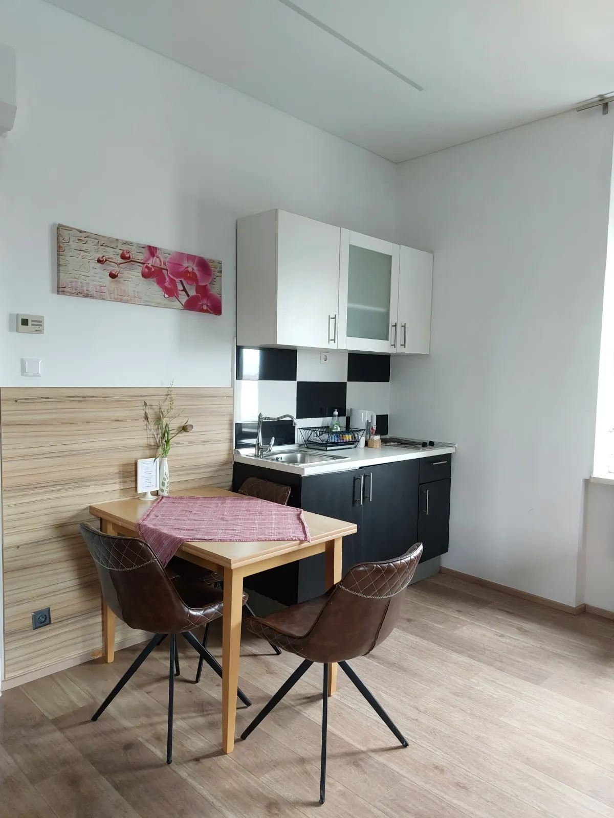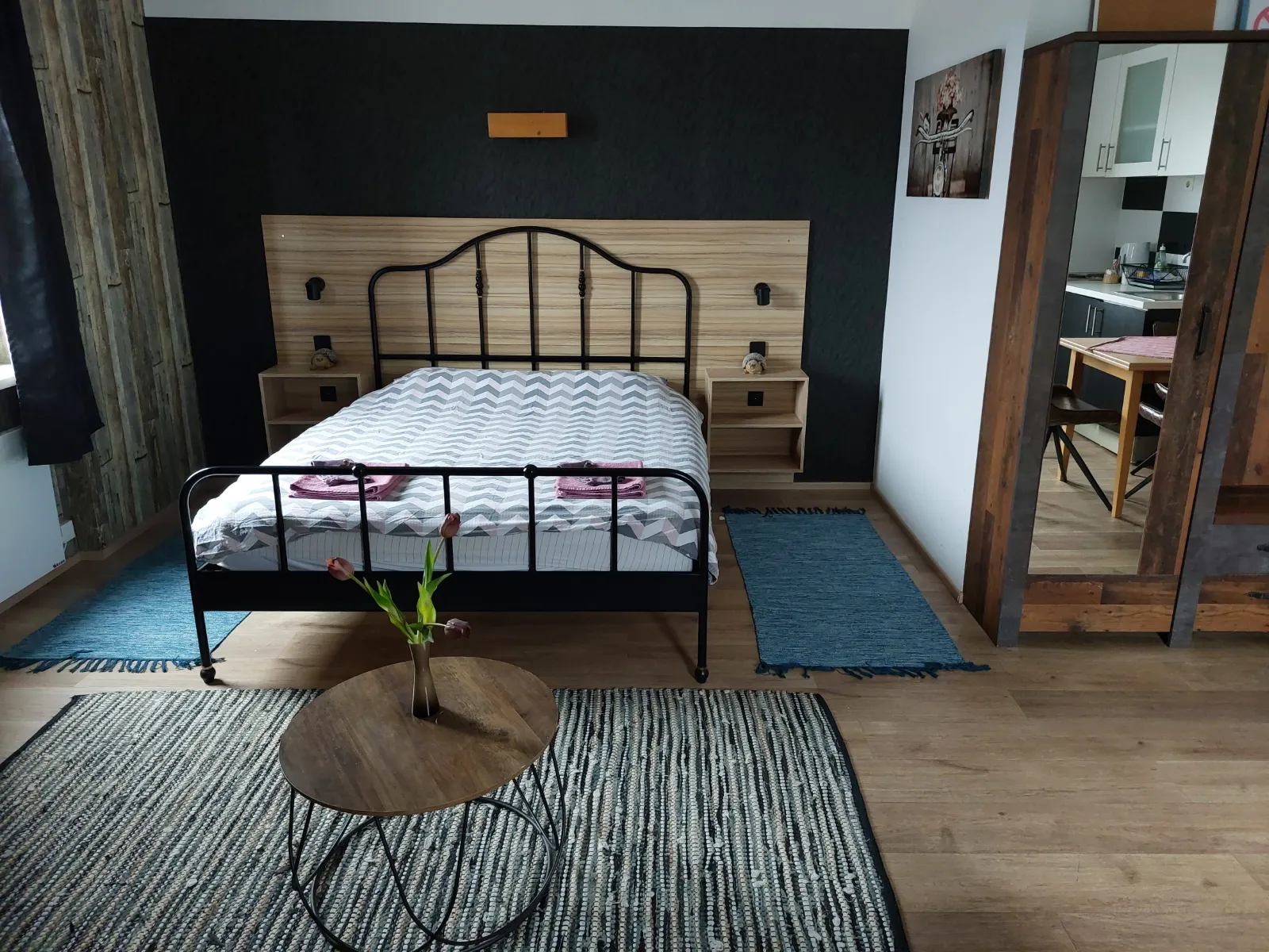 The studio apartmen is located on the second floor. where are four more rooms. It is equipped with one Queen bed with comfortable mattress for a good night sleep, and a folding armcahir that can be used as bed if needed. The studio apartment is in the corner of the building so it has view of the eastern and southern part of the city. It is decorated in a rustic style – walls covered in imitation wood wallpaper, wooden furniture, natural earthy tones prevail, pleasant and warm. The apartment has a kitchen with a refrigerator, a stove and everything else needed for cooking. The equipped bathroom has a shower cabin. Other facilities for a more pleasant and entertaining stay are a TV with an internet program package, interent and radio acces on TV. The apartment also has a table, chairs, a wardrobe, nightstands, reading lamps so you can easily store your belongings and feel just like at home.